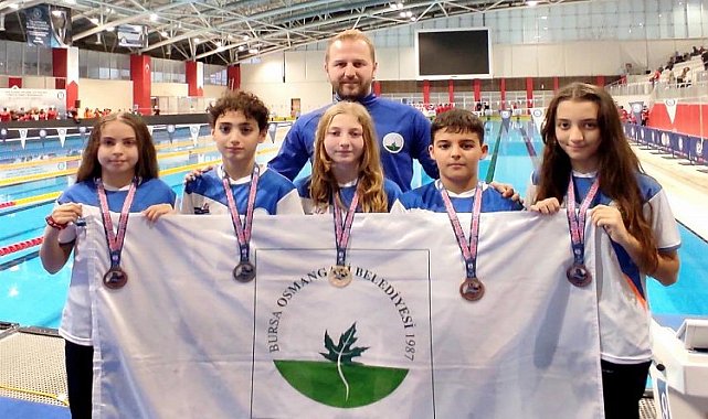Bursa'da Osmangazi Belediyespor Yüzme Takımı sporcuları, Samsun’da düzenlenen Ulusal Gelişim Projesi 11 Yaş Türkiye Finalleri Yarışları’nda 1 altın, 1 gümüş ve 3 bronz madalyanın sahibi oldu.BURSA (İGFA)-Türkiye Yüzme Federasyonu tarafından Samsun Olimpik Yüzme Havuzu’nda gerçekleşen Ulusal Gelişim Projesi 11 Yaş Türkiye Finalleri Yarışları, 138 kulüpten 543 sporcunun katılımıyla son buldu.Kıyasıya mücadelelerin yaşandığı müsabakaya Osmangazili kulaçlar damga vurdu. Rakipleri karşısında üstün performans sergileyen Melek Kepçetutar birincilik, Oğuz Kağan Ekinci ikincilik, Merve Mina Kılıç, Miray Yılmaz ile Ahmet Kaya ise üçüncülük kürsüsüne oturdu.Osmangazi Belediye Başkanı Mustafa Dündar, gelecek için vaat eden genç yetenekler ve antrenörlerini kutladı.