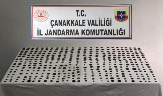 Çanakkale de jandarma tarafından düzenlenen operasyonda tarihi eser niteliği taşıyan 406 sikke ele geçirildi, 2 şüpheli gözaltına alındı.