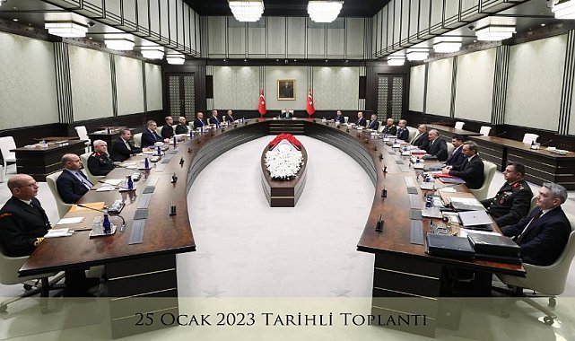 Cumhurbaşkanı Recep Tayyip Erdoğan başkanlığında yapılan toplantının ardından yazılı bir bildiri yayınlandı.Bildiride Türkiye'nin NATO'nun açık kapı politikasına destek verdiği belirtilirken, "NATO ittifakına katılmak isteyen devletlerin müttefiklik hukukuna ve ruhuna uygun hareket etmeleri gerektiğinin altı çizilmiştir" ifadelerine yer verildi.6 MADDEDEN OLUŞAN BİLDİRİ ŞU ŞEKİLDE:1. 2022 yılında milli güvenliğimiz açısından önem arz eden siyasi, askeri ve iktisadi gelişmeler tüm yönleriyle değerlendirilmiş: 2023 yılında karşı karşıya kalınması muhtemel meseleler ile bu çerçevede yürütülecek faaliyetler ve alınacak tedbirler müzakere edilmiştir.2. PKK/KCK-PYD/YPG, FETÖ ve DEAŞ terör örgütleri başta olmak üzere, milli güvenliğimize, birlik ve beraberliğimiz ile bekamıza yönelik her türlü tehdit ve tehlikeye karşı yurt içinde ve yurt dışında azim, kararlılık ve başarıyla icra edilen operasyonlar hakkında kurula bilgi sunulmuştur. İhtiyaç duyulması halinde daha ileri adımların atılacağı, bunun için gereken iradenin ve hazırlıkların tam olduğu kaydedilmiştir.3. PKK/KCK-PYD/YPG, terör örgütünün ve destekçilerinin, Suriye halkının barış, huzur ve refaha kavuşmasının önündeki en büyük engeli teşkil ettiği; terör örgütlerinin tamamen bertaraf edilerek Suriye’nin toprak bütünlüğünü ve egemenliğini esas alan kapsayıcı ve bütüncül bir çözüme ulaşılmasının, kalıcı barışa giden yolu açacağı belirtilmiştir.4. Yunanistan’ın sürdürdüğü kışkırtıcı eylem ve söylemleri ile silahlanma gayretlerinin, bölgemizdeki gerilimi artırmanın ötesinde bir fayda sağlamayacağı belirtilmiş Türkiye’nin milli güvenliğini ve menfaatlerini hedef alan herhangi bir oldubittiye hiçbir surette müsaade edilmeyeceği hususu, bir kez daha kuvvetle vurgulanmıştır.5. Türkiye’nin NATO’nun açık kapı politikasını desteklediği, buna mukabil NATO İttifakı’na katılmak isteyen devletlerin de müttefiklik hukukuna ve ruhuna uygun hareket etmeleri gerektiğinin altı çizilmiştir. PKK/KCK-PYD/YPG ile FETÖ başta olmak üzere terör örgütleri ile mücadele konusundaki mutabakat zaptından kaynaklanan yükümlülüklerini somut adımlarla bir an evvel yerine getirmelerinin zaruri olduğu ifade edilmiştir.6. İslam karşıtı ırkçılığın bir tezahürü olan ve milyarlarca insanın kutsal değerlerini hedef alan menfur saldırılar şiddetle kınanmış; din, vicdan ve düşünce hürriyeti gibi değerleri temellerinden sarsan, demokrasi ve ifade özgürlüğü ile de izah edilemeyecek eylemleri teşvik ve himaye edenlerin, insan haklarını hiçe sayan bu nefret suçuna ortak oldukları hatırlatılmıştır.