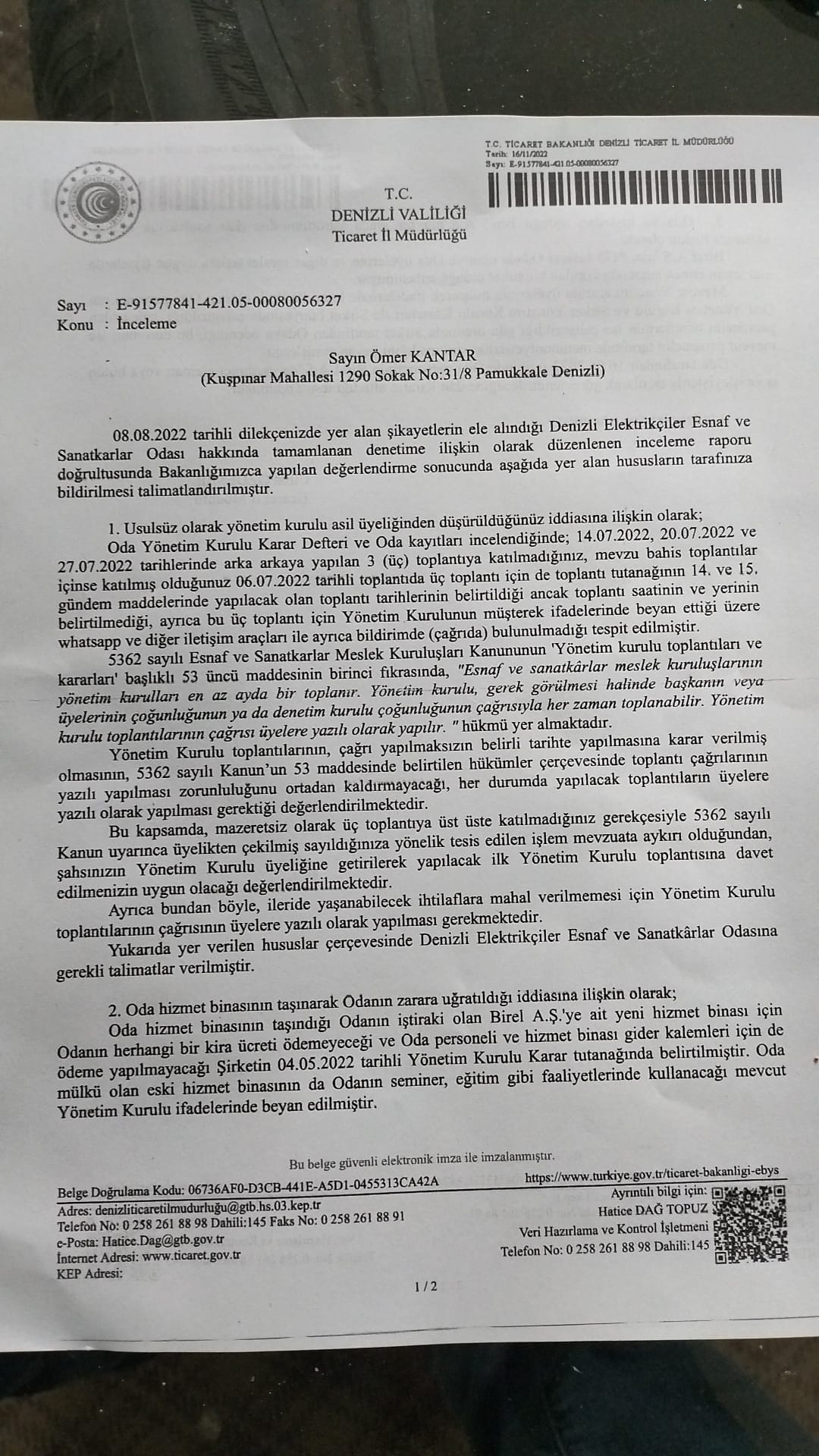 “Yukarda anlattığımız ve yaşanan tüm olaylar aslında odalarda dönenen mevzuata aykırı işlere bir örnektir. Tüm kamuoyunun bunları bilmesini istiyorum. Denizli Elektrikçiler Esnaf ve Sanatkarlar Odası’nın Yönetim kurulu, 11 gün içerisinde 3 yönetim kurulu toplantı gerçekleştiriyor. Üç toplantıya mazeretsiz katılmadığım iddiasıyla yönetimden çıkarıldım. Yönetim kurulu üyeleri ile görüşmeme rağmen iddialarından vazgeçmediler. Hakkımdaki asılsız iddiaları ortaya çıkarmak ve gerçekleri kamuoyunun bilgisine sunmak amacıyla Ticaret Bakanlığı’na başvuruda bulundum. Dört buçuk ayın sonunda, bakanlıktan alınan kararın asılsız ve yersiz olduğu, herhangi bir geçerliliği olmadığı, e imzalı bir belge ile tarafıma iletildi. 16.11.2022 tarihinde bakanlığın yayınladığı e imzalı karar ile görevime geri döndüm.