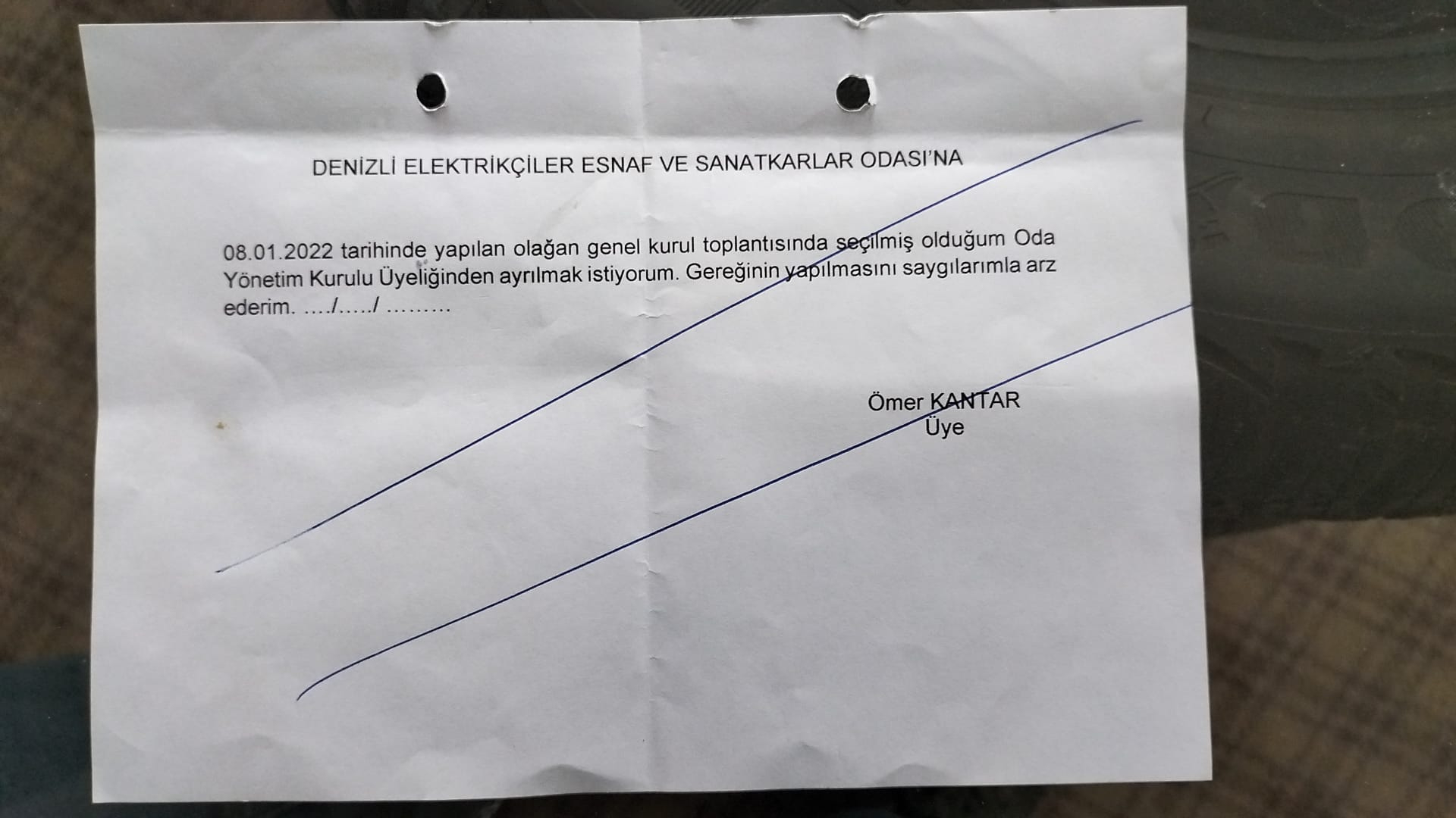 Denizli Elektrikçiler Esnaf ve Sanatkarlar Odası Başkanı Hasan Çetin’in bir sonraki toplantıda tüm oda üyelerinin önüne tarihsiz ve matbu bir istifa dilekçesi koyarak imzalamalarını istediğini iddia eden Ömer Kantar; “Bir sonraki toplantıda ise Hasan Çetin tüm yönetim kurulu üyeleri arkadaşlarımızın önüne; tarihsiz, hazır ve matbu bir istifa kağıdı koyup, “bana güveniyorsunuz imzalayın” dedi. Bu kağıdın neden imzalatmaya kalkıldığını sorduğumda ise, Elektrikçiler Odası Başkan Yardımcısı Mehmet Ali Coşkun, “bunun siyasi partilerde yapıldığını ve normal olduğunu” ifade etti. Mehmet Ali Coşkun’un bu savunması üzerine bende; buranın bir siyasi parti olmadığını, devletin resmi kurumu, bir oda olduğunu belirterek tüm istifa kağıtlarını üyelerin önünden toplayıp, kendim dahil kimseye imzalatmadım” İfadelerine yer verdi.