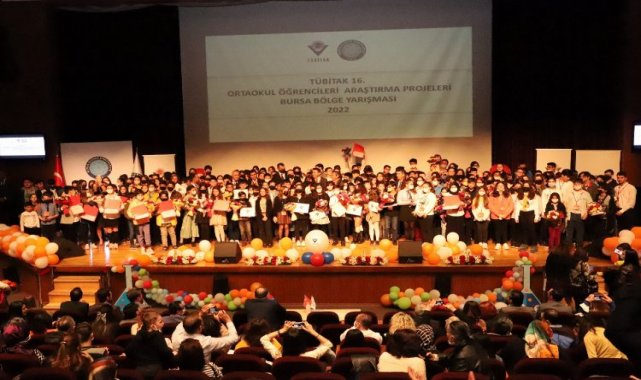 Tübitak 16. Ortaokul Öğrencileri Araştırma Projeleri Bursa Bölge Yarışmasında ödüller sahibini buldu.BURSA (İGFA) - Uludağ Üniversitesi Prof. Dr. Mete Cengiz Kültür Merkezinde gerçekleştirilen TÜBİTAK 16. Ortaokul Öğrencileri Araştırma Projeleri Bursa Bölge yarışmasında ödüller sahibini buldu.Ödül törenine Bursa İl Millî Eğitim Müdürü Serkan Gür, TÜBİTAK Bursa Koordinatörü Prof. Dr. Mustafa Özkan, Çanakkale İl Millî Eğitim Müdürü Ferhat Yılmaz, Balıkesir İl Millî Eğitim Müdürü Ali Tatlı, TÜBİTAK Bursa Koordinatör Yardımcısı Doç. Dr. Şehnaz Baltacı, Millî Eğitim Şube Müdürleri, öğrenciler ve danışman öğretmenleri ile davetliler katıldı. Bursa Bölgesine bu yıl başvuru yapan 667 proje arasından 101 tanesi bölge sergisine davet edildi. Yarışma, Biyoloji, Fizik, Tarih, Coğrafya, Kimya, Teknoloji Tasarım, Yazılım, Değerler Eğitimi, Matematik ve Türkçe olmak üzere 10 ana alanda düzenlendi.