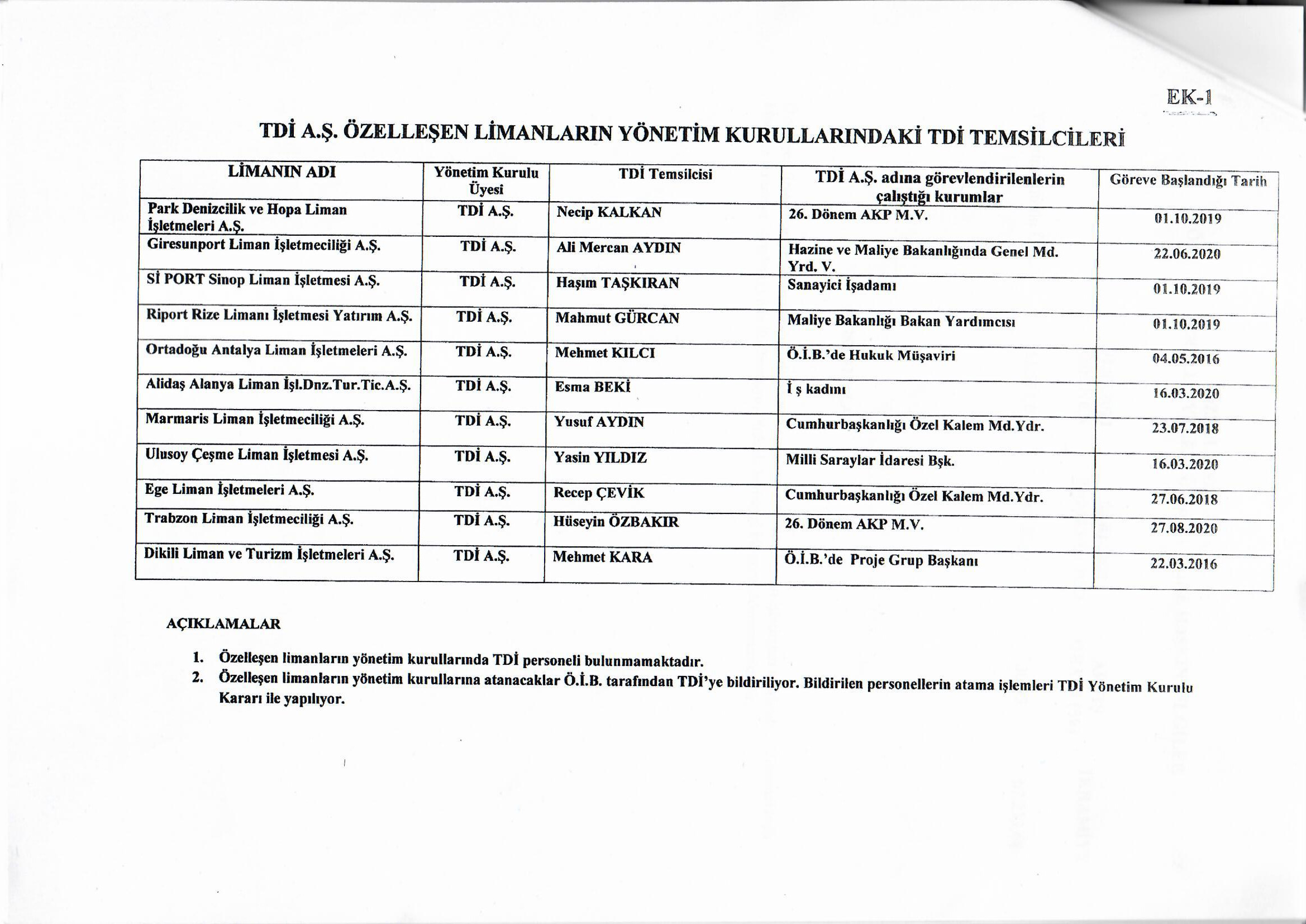 “Park Denizcilik ve Hopa Liman İşletmeleri yönetimine 26. Dönem AKP Milletvekili Necip Kalkan, Giresunport Liman İşletmeciliği yönetimine Hazine ve Maliye Bakanlığı Genel Müdür Yardımcısı Vekili Ali Mercan Aydın, Si Port Sinop Liman İşletmesi yönetimine iş adamı AKP Meclis Üyesi Haşım Taşkıran, Riport Rize Limanı İşletmesi yönetimine Maliye Bakanlığı Bakan Yardımcısı Mahmut Gürcan, Ortadoğu Antalya Liman İşletmesi yönetimine Özelleştirme İdaresi Başkanlığı Hukuk Müşaviri Mehmet Kılcı, Alidaş Alanya Liman İşletmesi yönetimine stilist, Modacı Esma Beki, Marmaris Liman İşletmesi yönetimine Cumhurbaşkanlığı Özel Kalem Müdür Yardımcısı Yusuf Aydın, Ulusoy Çeşme Liman İşletmesi yönetimine Milli Saraylar İdaresi Başkanı Yasin Yıldız, Ege liman İşletmeleri yönetimine Cumhurbaşkanlığı Özel Kalem Müdür Yardımcısı Recep Çevik, Trabzon Liman İşletmesi yönetimine 26. Dönem AKP Milletvekili Hüseyin Özbakır ve Dikili Liman İşletmesi yönetimine Özelleştirme İdaresi Başkanlığı Proje Grup Başkanı Mehmet Kara atanmış. Bu isimlerin hiçbirinin denizle denizcilikle ilgisi yok. ama Türkiye Denizcilik İşletmelerini temsilen özelleştirilen bu limanlarda görev görüyorlar.”